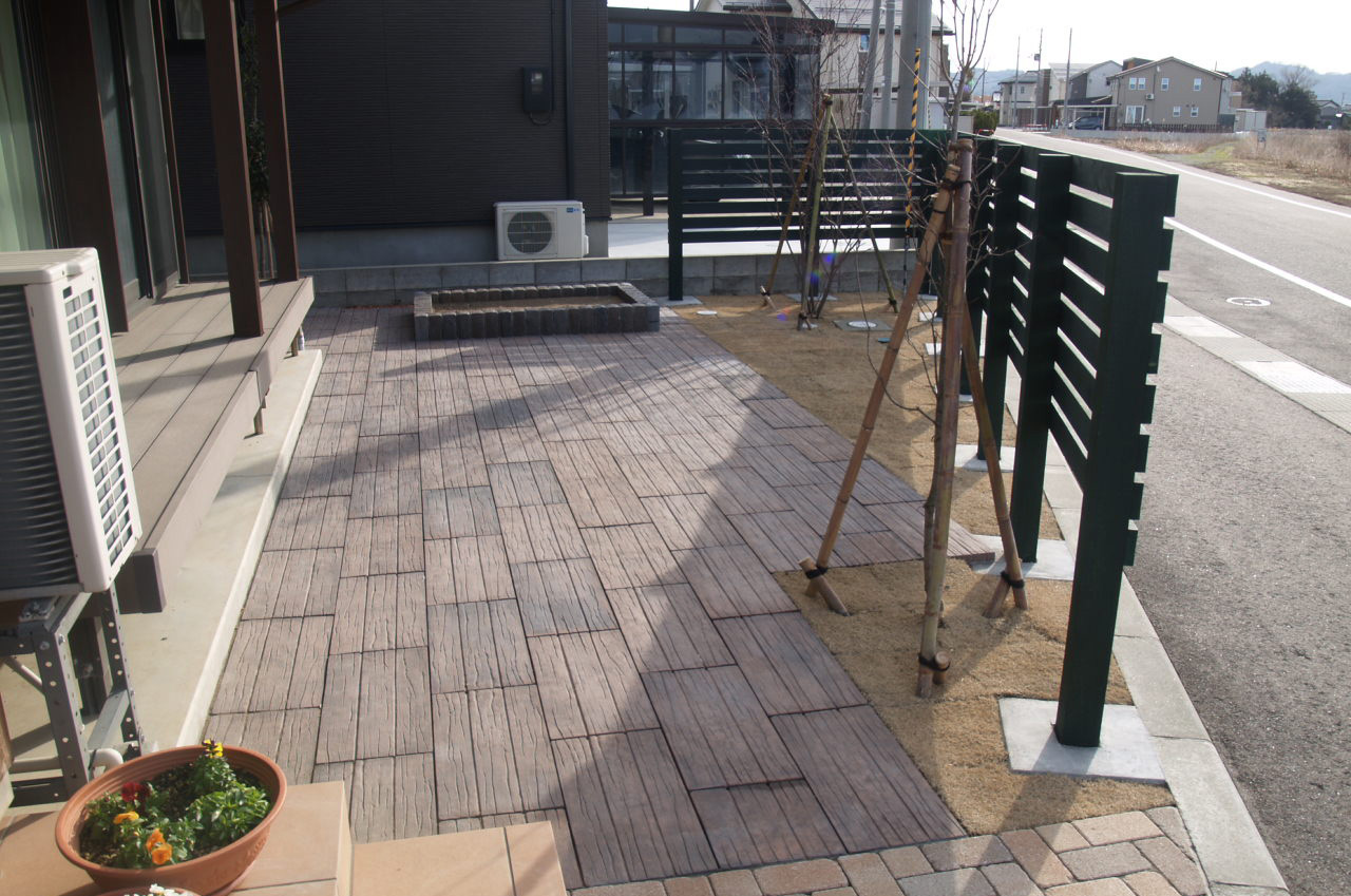 天然木のぬくもりや「古木感」を表現したコンクリート製のデザインペイバー。自然の中にいるような味わいのある印象に。
