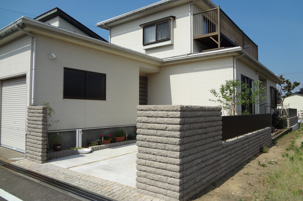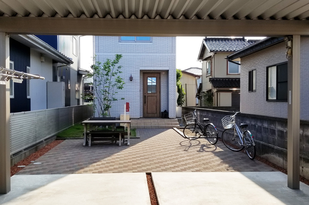 お客様をやさしく出迎えるアプローチ。光の陰影を感じる趣のあるインターロッキングです。アプローチとつながる広いテラスはみんなが集うふれあいの空間。カーポートの後に位置しているため、車の駐車スペースとしても使えます。