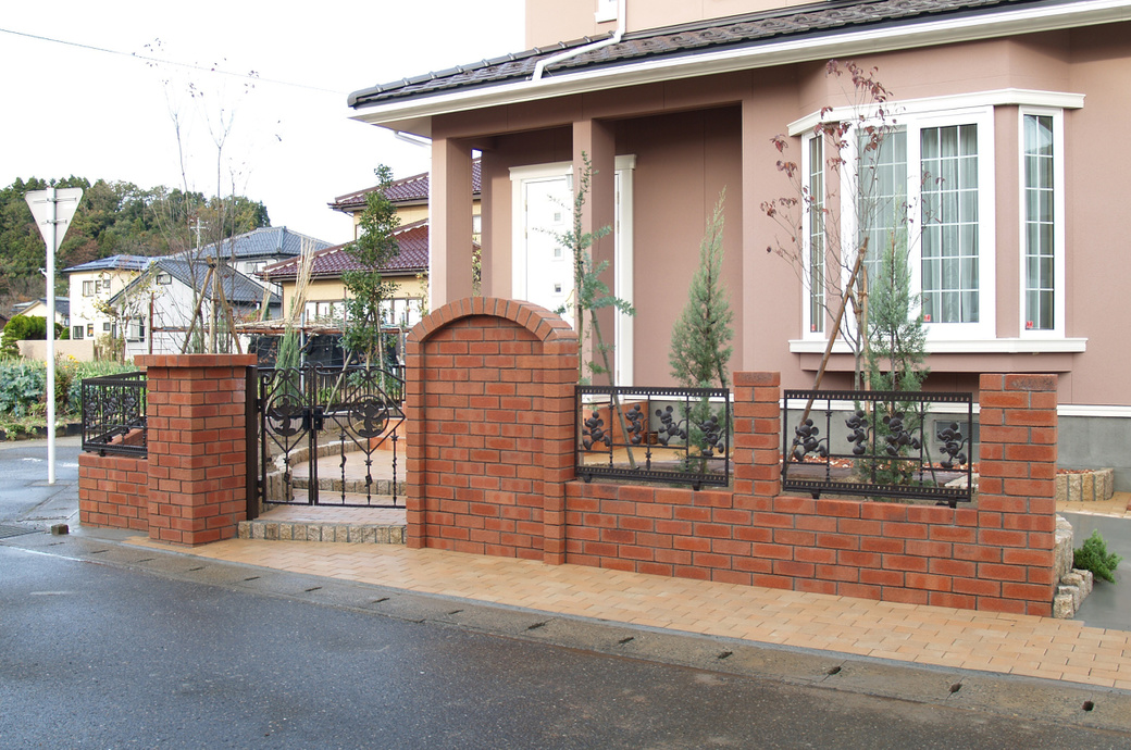 焼きムラに味わいと温もりを感じるレンガの門塀。ミッキーの門扉とフェンスが明るくお迎えします。