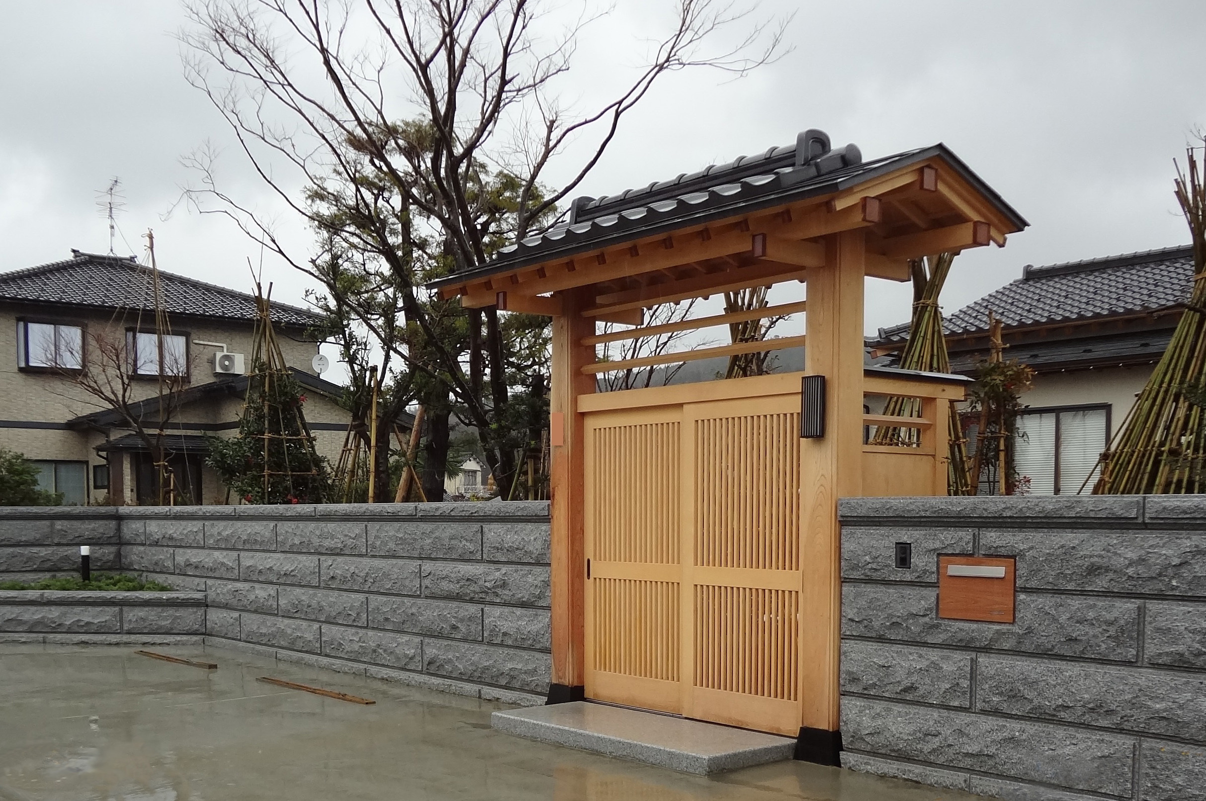 立派な数奇屋門の両脇にどっしりと構える塀は重厚感のある大型寸法の御影石を組積しました。
